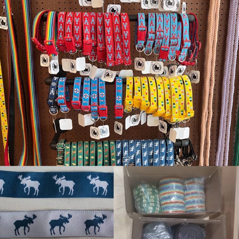 Introducing The Maine Pooch. She has partnered with us to transform her original designs into woven ribbons, which she subsequently crafts into leashes and dog collars. To date, we have collaborated on all year round designs as well as Halloween and Christmas themed designs, in addition to producing sublimation-printed tags for her apparel line. As we embark on a new session, we eagerly anticipate her upcoming creations. For more information, please visit